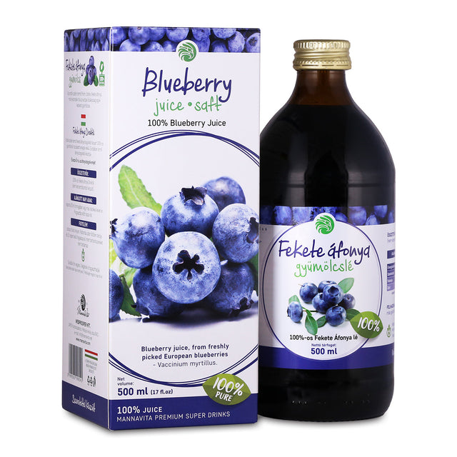 Mannavita 100% jugo de arándano es un jugo directo hecho de arándanos negros (Vaccinium myrtillus) cultivados en el borde de los bosques.